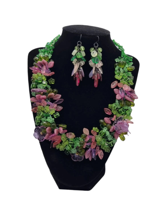 Pink & Green Crystal Necklace with Earrings